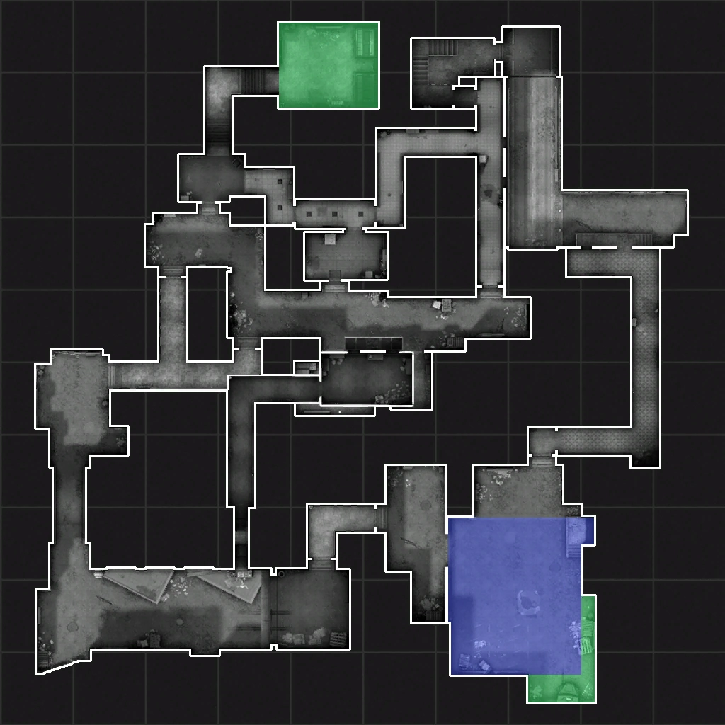Terrorists spawn in the indoor basement area, below the buildings holding the hostages, while the Counter-Terrorists spawn outdoors, where they have two paths to choose.