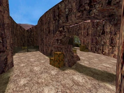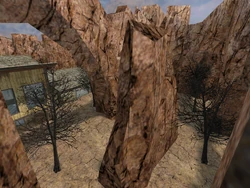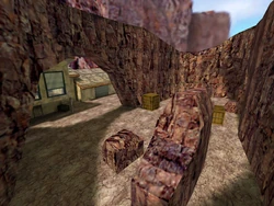 When playing with bots in 1.6 or in Condition Zero, when they are awaiting for the CTs in concealed areas, it is possible to perform a trick by pushing the hostages against the wooden fence at the area where the boxes is located in the spawn zone. This allows you to rescue the hostages without having to fight or establish contact with the Terrorists. In Source, some bots may camp behind the fence but the small openings in the fence can allow human players to see bots and eliminate them by wallbanging. Beware for both tricks however, as bots will start moving around after seeing their ally dies in their view or a hostage has been rescued. So be sure act fast or throw Flashbang if they have detected your presence.