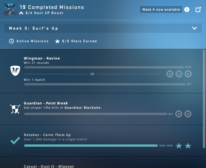 For the first 16 weeks of Operation Riptide, there are missions for the player to complete where they can earn stars to use in the Operation Riptide Shop. Players can only earn a maximum amount of stars per week though additional completed missions earn the player a Bonus XP which rewards 5000 XP.
