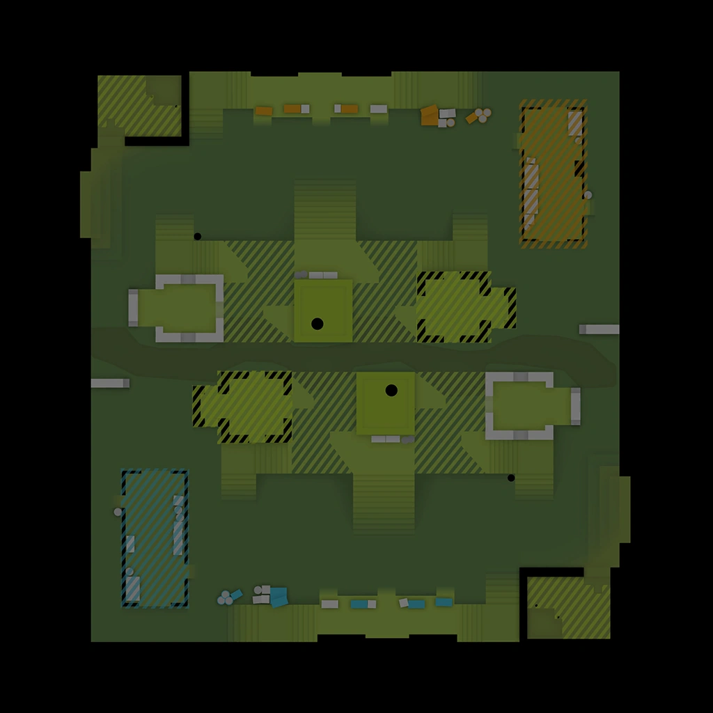 Shoots is a symmetrical map. The Terrorists and Counter-Terrorists spawn on opposite sides of the map, with identical cover provided for both sides.