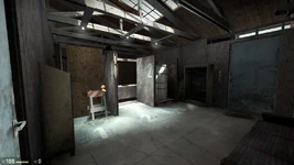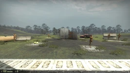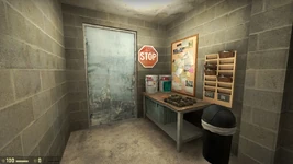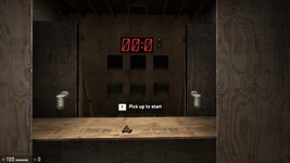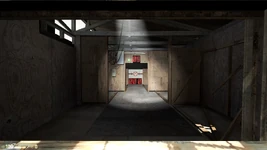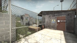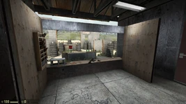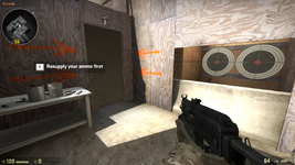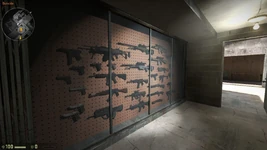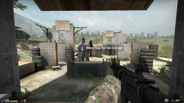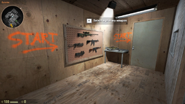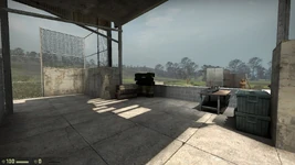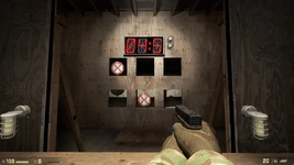 When the player enters the timed course, they will see a gun cabinet with every weapon in the game at release time (which excludes the Zeus x27, and weapons added since release such as the MP5-SD), but these weapons are unobtainable (this gun cabinet also appears on Assault, near the office inside the warehouse). Next, they will enter a room with another Five-SeveN and a Knife on a table next to a new case of infinite HE Grenades, and a wall holding a PP-Bizon, M4A4, AK-47, P90, and AWP. The player is told to pick the weapon of their choice along with a grenade, and the knife and pistol. The next room contains an ammunition pile and leads into the timed course. Additionally, there is another outdoor area where the player can practice shooting at targets and physics objects out of bounds, such as bottles and cans on a pickup truck.