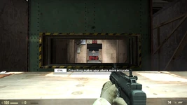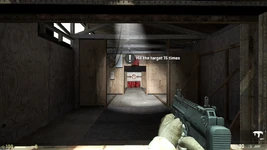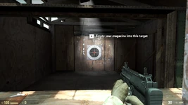 Afterwards, the player has to hit a target from medium range, and the instructor informs them that firing in controlled bursts will maintain accuracy. Upon doing so, the target will be obstructed by a thin wooden board, which the player must again shoot through 15 times. Finally, a thick metal plate will be lowered between the player and the board (an impenetrable surface), and the player must crouch to hit the target 15 more times. They are then informed that crouching will somewhat boost their accuracy.