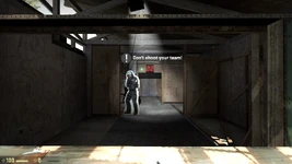 Around the corner, the player will find another room with 2 more Phoenix targets on the back wall, with a few more CT targets. After shooting down the enemy targets and walking through the open door, the player will be told to equip the Knife and run to the finish, and will see their current time. They are told they can try it again as many times as they wish, or they can exit to the left hallway (which leads the player back to the main menu). Hitting the use key on the door at the end will ask if they wish to exit the course and will suggest practicing against bots if the player does not yet feel comfortable playing against other human players.