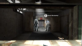 Next, the player will be told to head to the pistol range through the next door. Another shooting range with a Glock-18 is to the left, with six holes in the wall for targets. The player must pick up the Glock and then hit 2 targets that pop up in any of the six holes within 5 seconds. After doing so, they must pick the Glock up again and are told to repeat the process. This time, a Flashbang will drop from the ceiling and blind them if they don't look away, and if blinded, the instructor will tell them to look away from the explosion or get behind something to prevent this. After picking up the Glock again, the process repeats, and the player may advance after dodging the flashbang and hitting the targets. If the player looks away from the flashbang when it first drops, then shoots the targets in time, they will not have to redo the test. The instructor will congratulate the player on avoiding the flashbang.