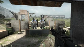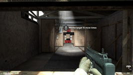 The first room of the timed course contains a few more Counter-Terrorist targets and another ammo pile, along with more Phoenix targets which must be hit. After hitting them all, the player must jump over a concrete block and head to the right and up a set of stairs where more targets will appear, two in front and two CT targets to the right, with 2 more Phoenix targets inside a wall next to them. An on-screen prompt will tell the player to throw a grenade at the slanted boards in front of them (which will instantly hit both Phoenix targets to the right) and they may continue after taking out the ones in front. Moving forward, they will have to duck under a blockade with another CT target at the end. As they near it, another Flashbang will be thrown out, and they will have to look away.